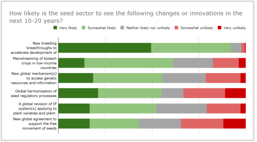 当被问及种子行业在未来10-20年内会发生一系列变化或创新的可能性有多大时,新育种技术突破所带来的良种培育加速被认为是最有可能发生的事件。其他被认为有可能会发生的变化或创新包括生物技术作物在低收入国家的主流化,以及获取遗传资源和信息,并分享利益的新全球机制。
