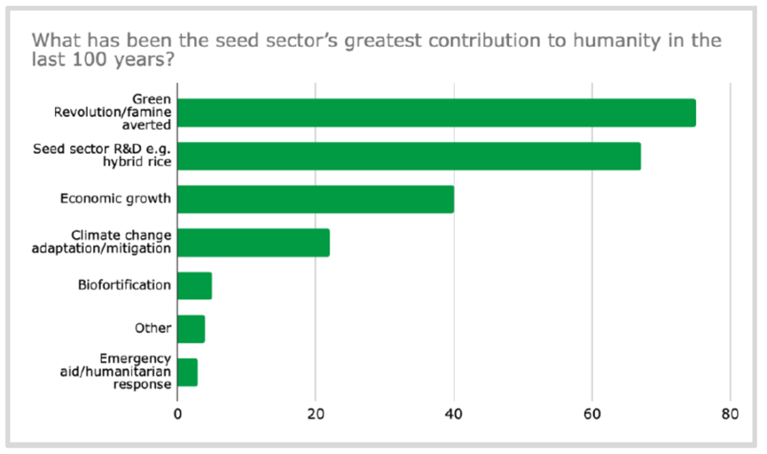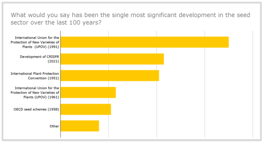 当被问及过去100年种子行业所取得最大的进步时,有32%的受访者(共70人)选择了《国际植物新品种保护联盟公约》(1991年)的建立,该公约更新了植物育种者的权利内容。10% 的受访者(共23人)则认为原版公约(1961年)是行业最大的进步。