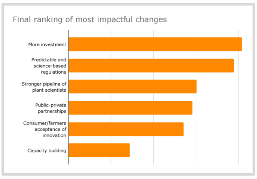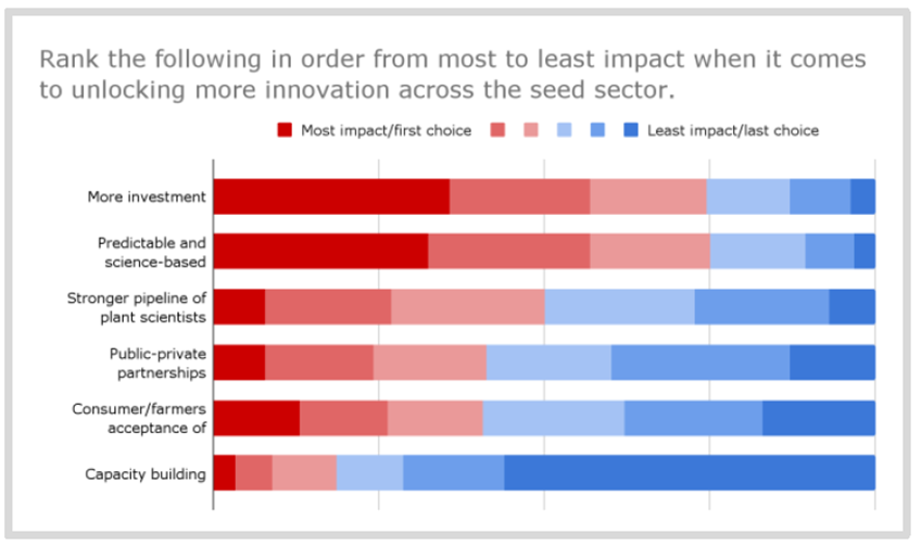 当被问及对推动种子行业进步最具影响力的变化进行排名时,36%的受访者对“进行更多投资”这一项的排名最高(注意:这里包括私营和公共部门投资)。其他排名靠前的变化包括可预测的和基于科学的法规建立以及更多植物科学家的出现。