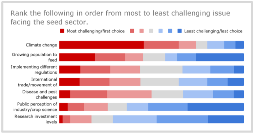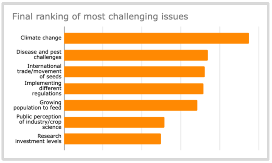 当被要求对种子行业面临的最具挑战性问题进行排名时,44%的受访者将气候变化评为首位。其他排名靠前的挑战包括病虫害挑战(这也与气候变化越来越相关)以及国际贸易/种子流通。