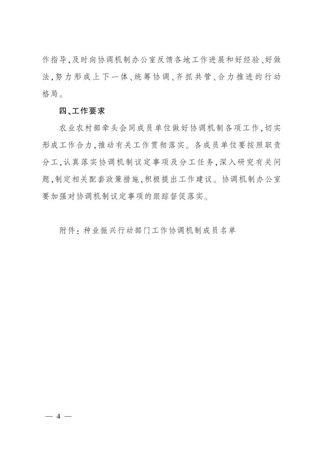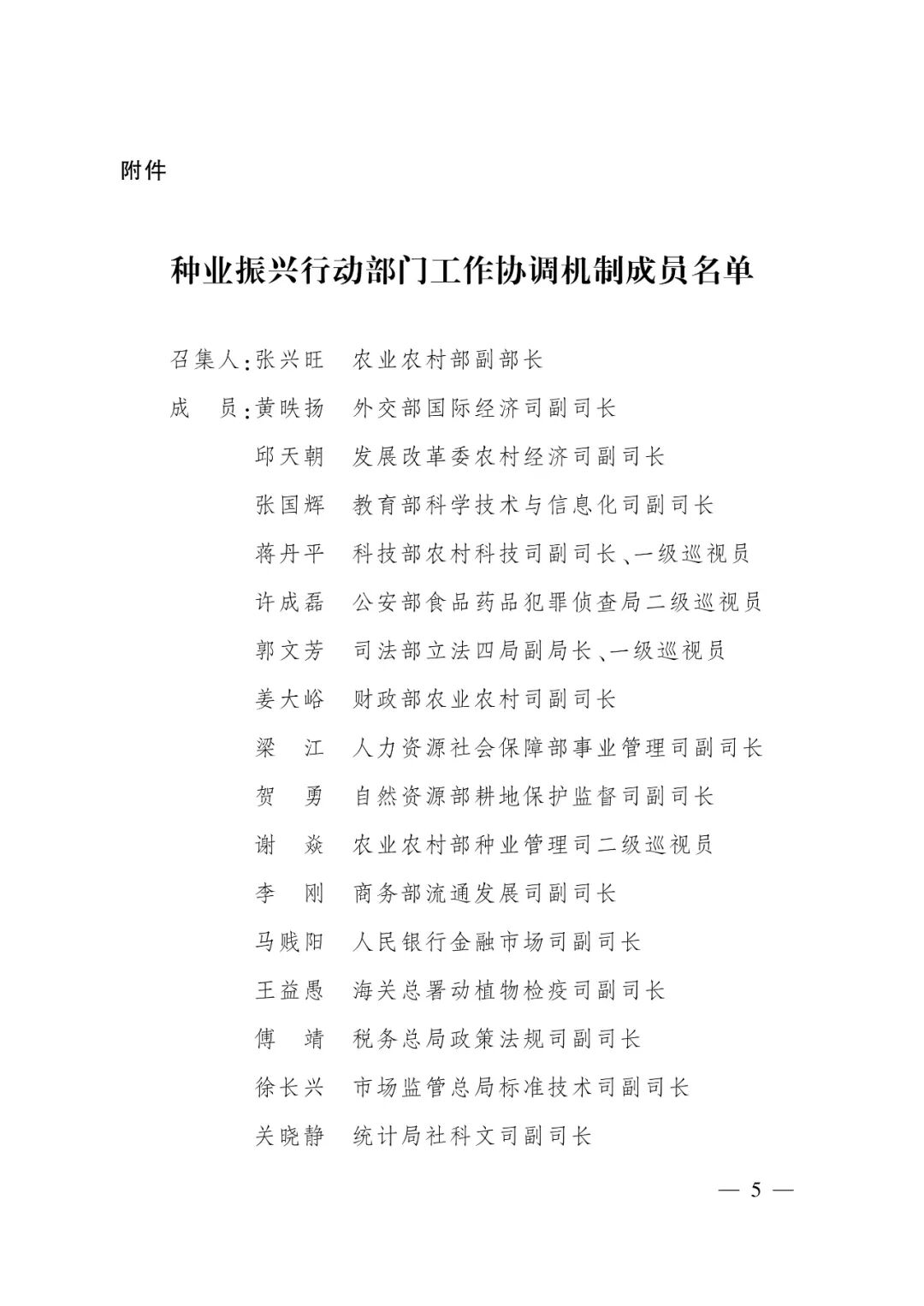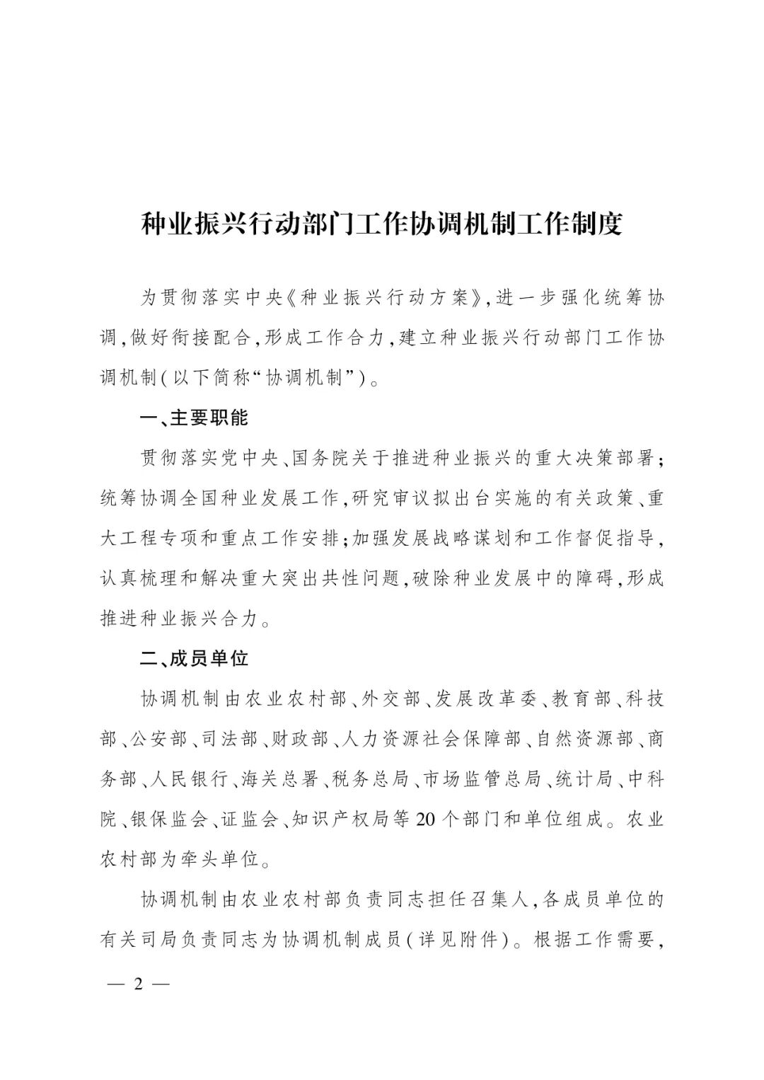 农业农村部联合外交部、发展改革委、教育部、科技部、公安部、司法部、财政部、人力资源社会保障部、自然资源部、商务部、人民银行、海关总署、税务总局、市场监管总局、统计局、中科院、银保监会、证监会、知识产权局等19个部门,根据《种业振兴行动方案》有关要求, 建立种业振兴行动部门⼯作协调机制 (以下简称“协调机制”)。