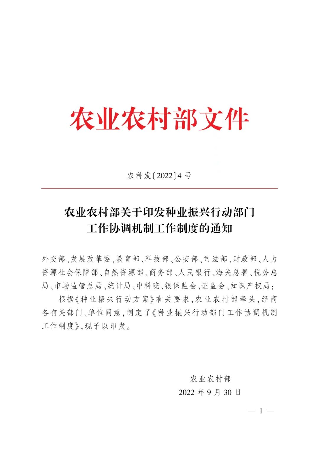 20部门联合制定《种业振兴行动部门工作协调机制工作制度》,合力推进种业振兴
