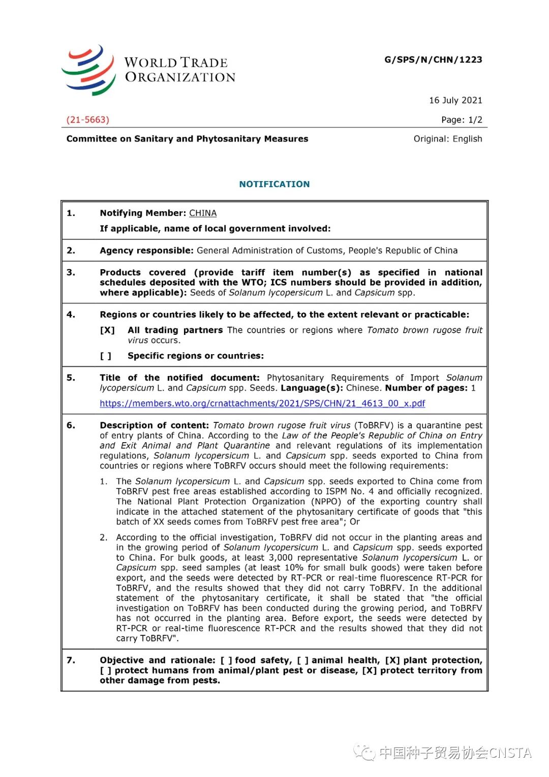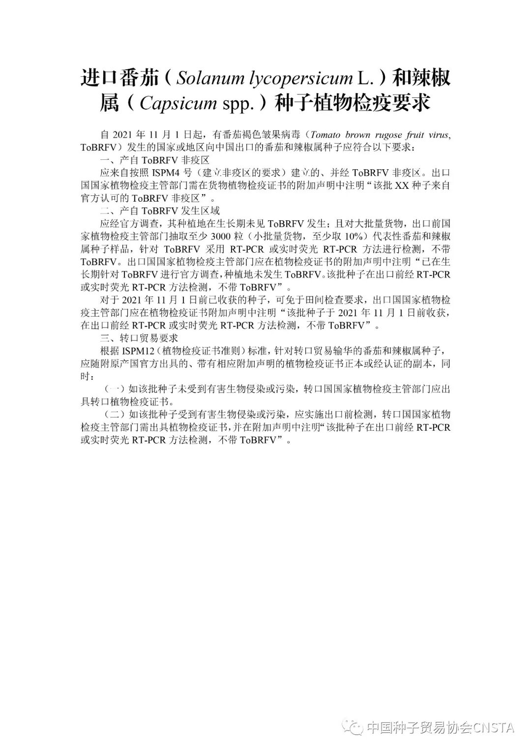 近日,应中国海关请求,世贸组织卫生与植物检疫措施委员会发布了关于进口到中国的番茄和辣椒属种子植物检疫要求的最新细则,该内容基于2021年7月16日发布的G/SPS/N/CHN/1223号通知,并对其做了新的说明。