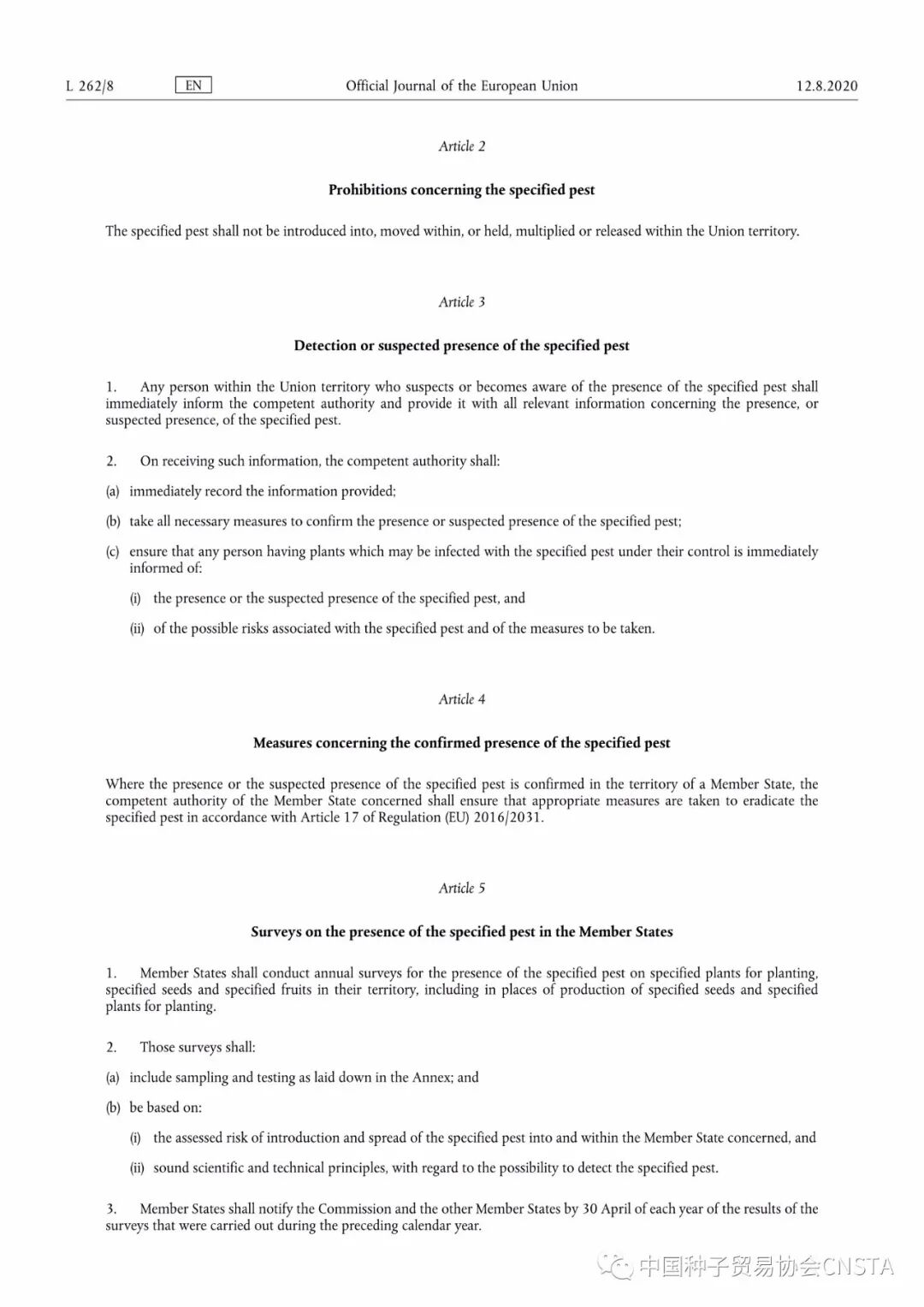 2. 对在2020年8月15日之前仍在储存中的特定种子,应在进入欧盟之前,由主管当局官方监督下的专业操作人员对特定有害生物进行取样和检测,经检测没有发现特定有害生物,种子才能在欧盟内流动。