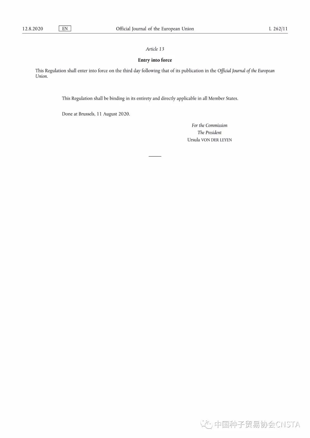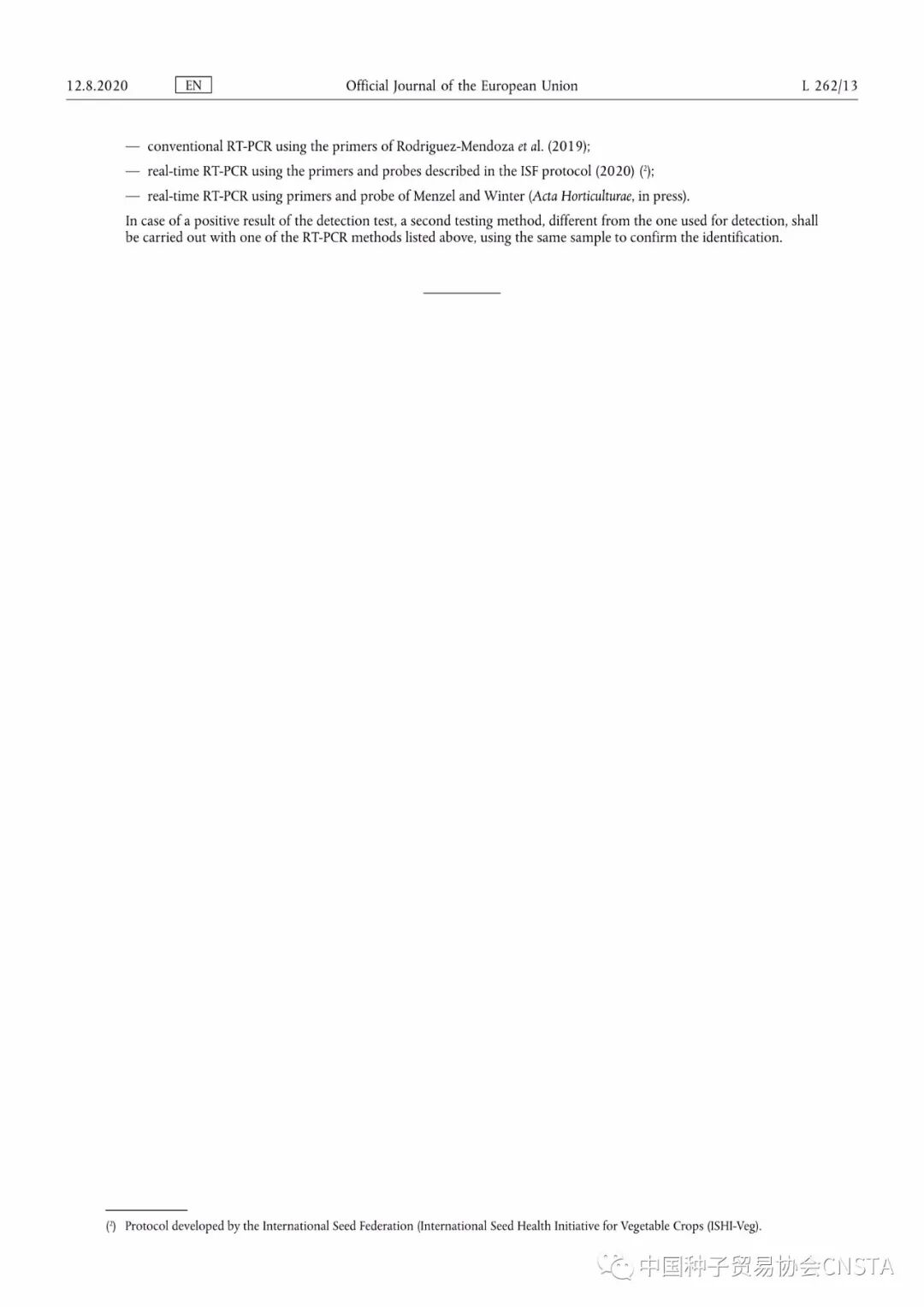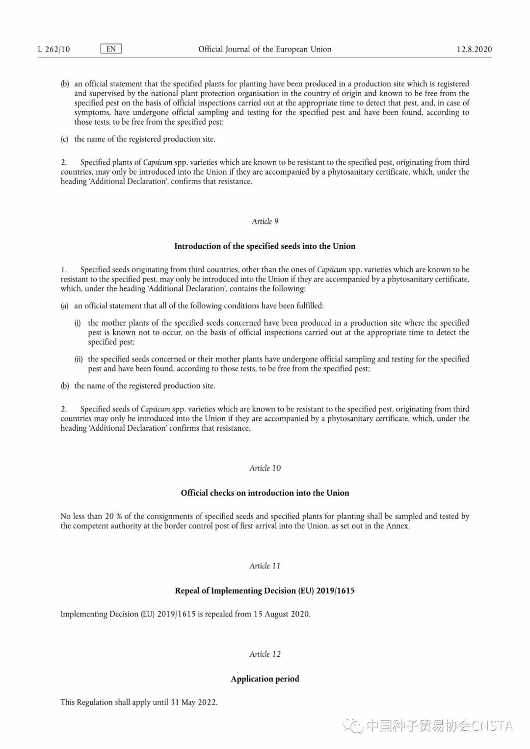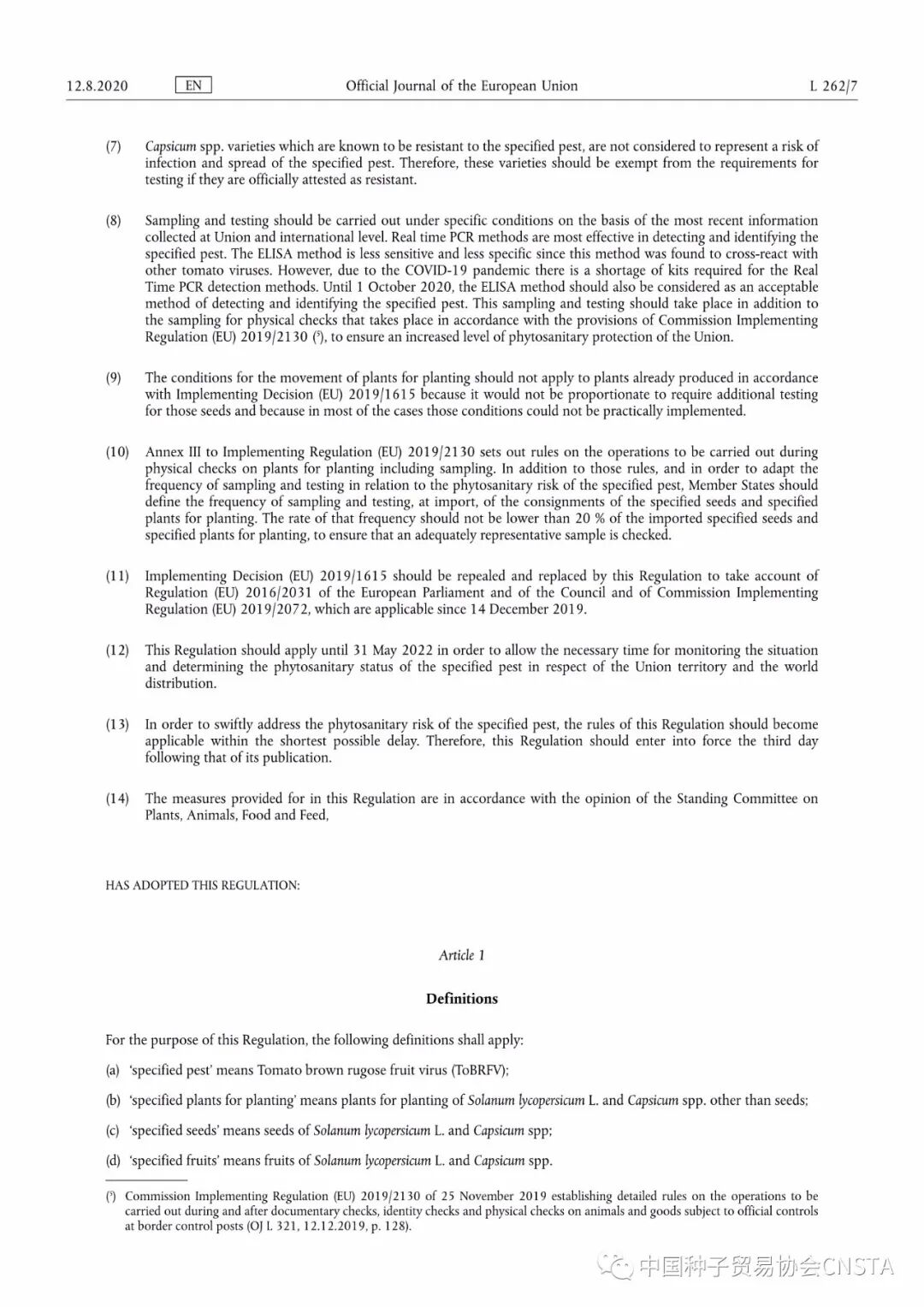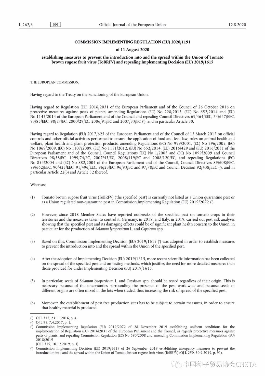 为防止番茄褐色皱纹果病毒(ToBRFV)引入欧盟并在欧盟内传播,2020年8月11日,欧洲联盟官方公报(OJEU)颁布了第(EU)2020/1191号《欧盟委员会实施条例》。新规背景及条例由中国种子贸易协会秘书处翻译,具体详见下文。
