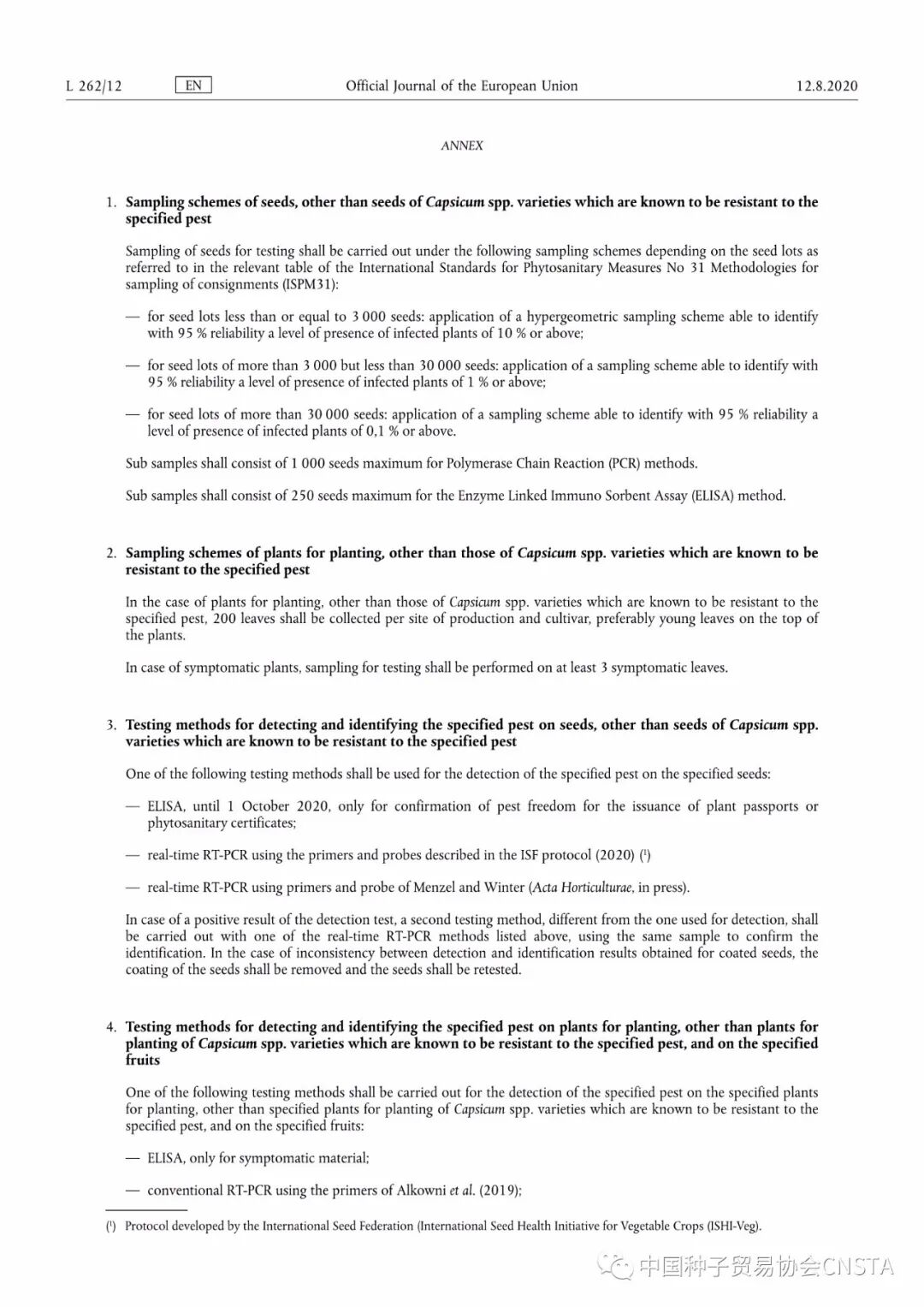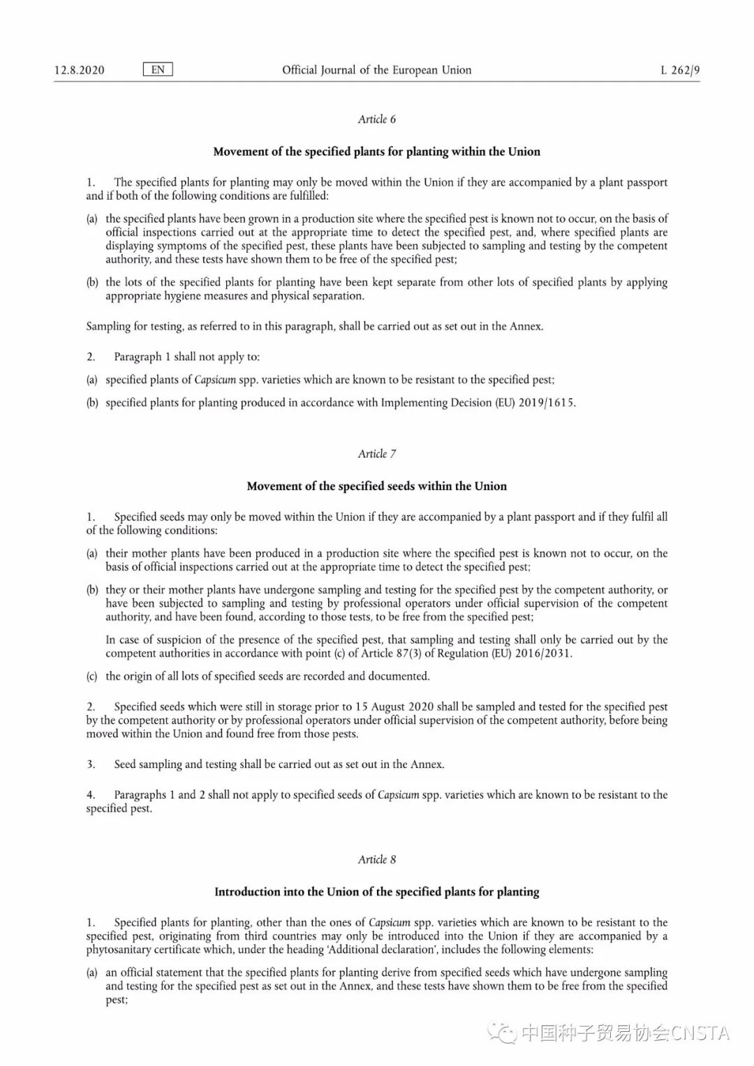 1. 原产第三国的特定种子,除了已知对特定有害生物具有抗性的辣椒品种外,只有在其附有植物检疫证书的情况下,才可以引进欧盟,并且在植物检疫该证书“附加声明”中要包含以下内容: