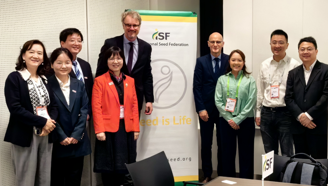 (2024世界种子大会期间,种贸协、中种协与国际种子联盟举行会谈。右四为国际种子联盟主席Marco Van Leeuwen、左五为国际种子联盟秘书长Michael Keller、右三为亚太种子协会秘书长Francine Sayoc、右二为种贸协理事长应敏杰、左二为种贸协秘书长田伟红、左三中种协国际合作交流部主任刘鑫)