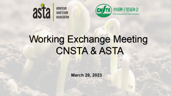 2023年3月28日上午(北京时间),中国种子贸易协会与美国种子贸易协会召开线上工作会议。中国种子贸易协会秘书长田伟红女士,美国种子贸易协会总裁兼CEO Andrew LaVigne先生和科学事务与政策副总裁Fan-Li Chou博士等中美协会双方领导出席了本次会议。双方回顾了去年的工作成果和来年的工作计划,围绕植物育种创新、种子贸易和植物检疫、遗传资源、种子认证、实质性派生品种等话题展开讨论,并就下一阶段重点工作与合作事项达成共识。