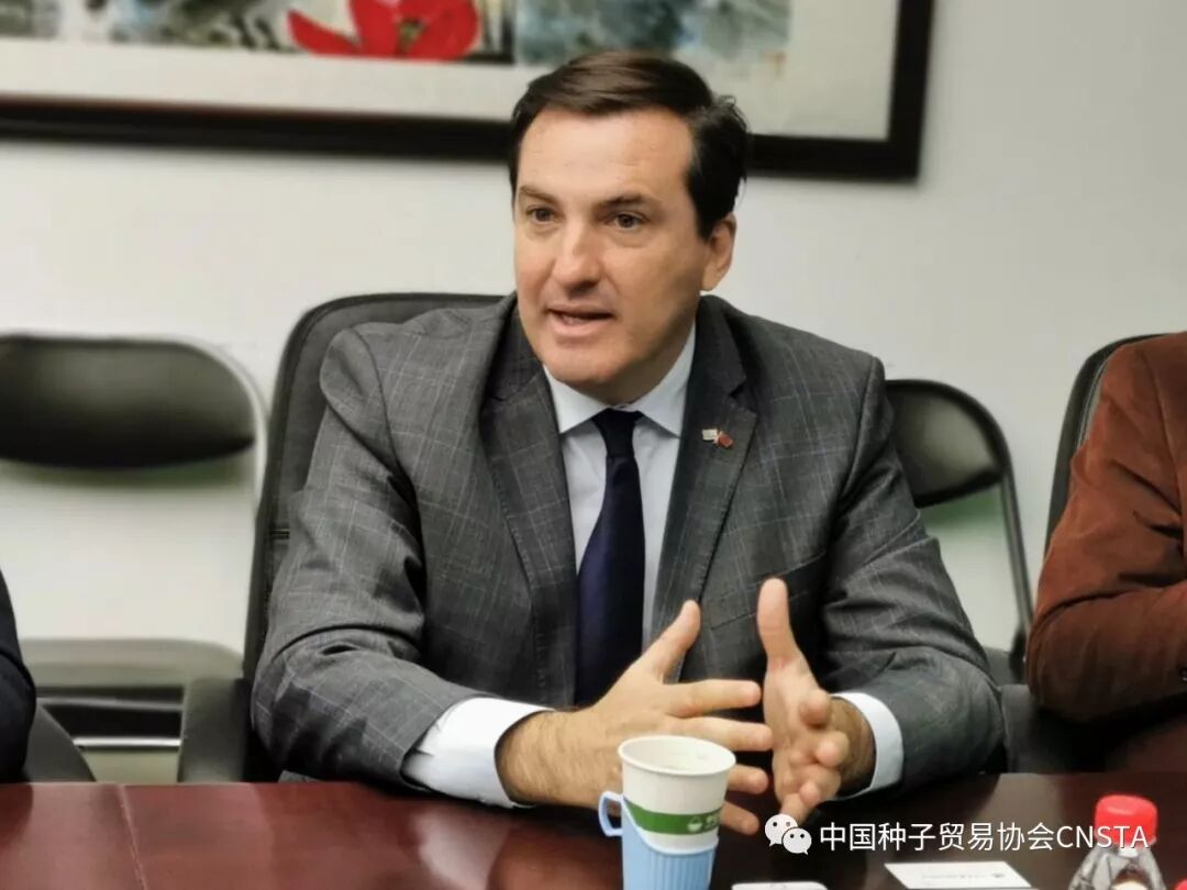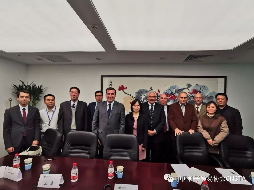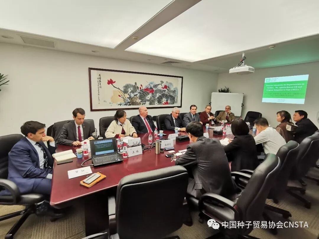 2019年11月13日,乌拉圭索里亚诺省省长奥古斯丁•巴斯库•吉尔先生在乌拉圭驻华大使费尔南多•卢格里斯先生的陪同下,率当地大型企业家代表团造访中国种子贸易协会(以下简称“种贸协”)。这是继2018年5月,乌拉圭牧农渔业部部长恩佐•贝内奇先生一行造访后,乌拉圭代表团再次来访种贸协。种贸协秘书长田伟红代表协会热情接待了省长一行并与省长先生进行了会谈。参加会谈的乌方人员有乌拉圭索里亚诺省省长吉尔先生、乌拉圭驻华大使卢格里斯先生、索里亚诺农村协会主席罗德里格斯先生、索里亚诺省当地企业家代表以及乌驻华使馆官员,中方人员包括中种集团、大北农集团、北京正道等种贸协会员单位代表。