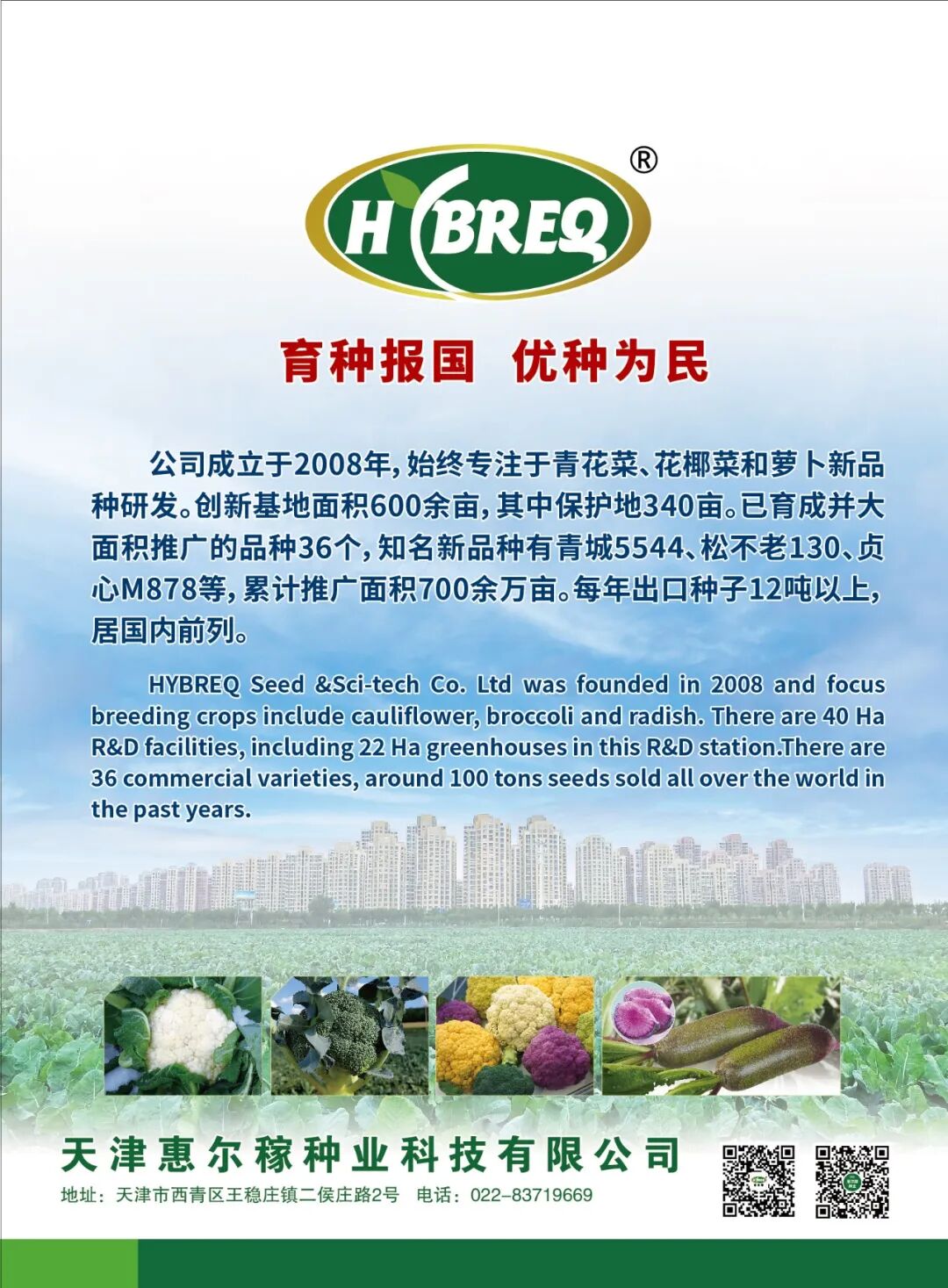 天津惠尔稼种业科技有限公司成立于2008年,十几年来专注花椰菜、青花菜品种的选育和研发,是一家集 “育、繁、推”为一体的商业化育种企业。同时也是国家西兰花重大科研联合攻关组成员单位、国家级高新技术企业、种子行业信用评价AAA级企业。